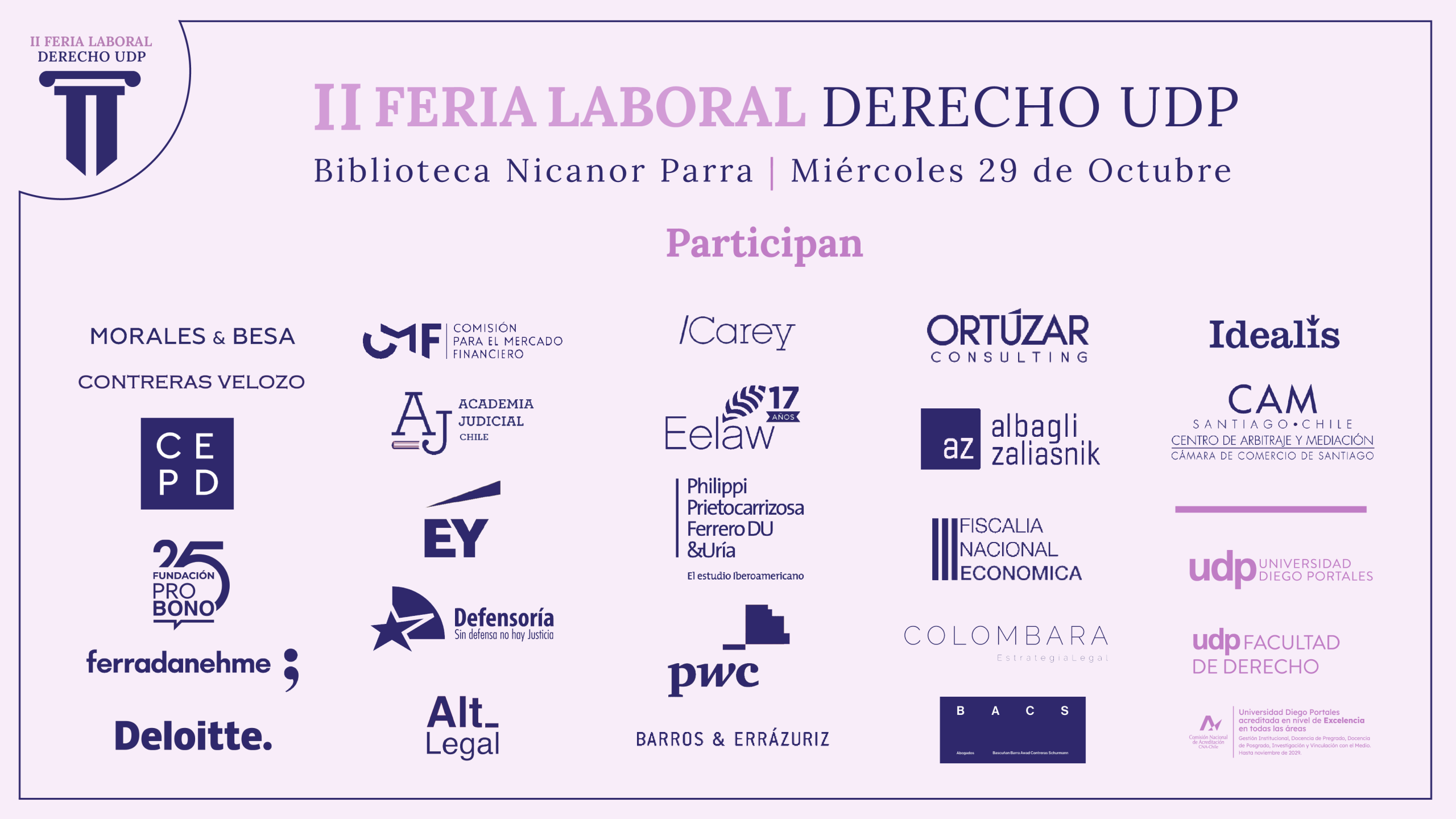 El próximo 29 de octubre se llevará a cabo la Segunda Feria Laboral de la Facultad de Derecho de la Universidad Diego Portales en la Biblioteca Nicanor Parra (Vergara 324, Santiago) entre 9:00 y 14:30 hrs. Esta es una iniciativa organizada por la Facultad de Derecho de la UDP que busca aproximar a jóvenes abogados y abogadas y estudiantes de Derecho de los últimos años de carrera al mundo de la profesión jurídica.