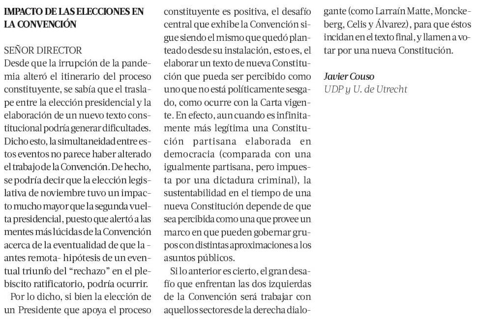 “La sustentabilidad en el tiempo de una nueva Constitución depende de que sea percibida como una que provee un marco en que pueden gobernar grupos con distintas aproximaciones a los asuntos públicos”.