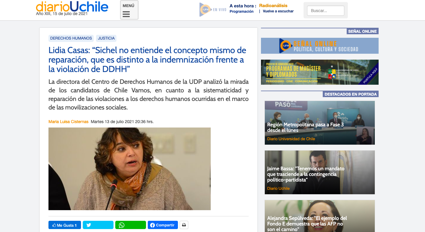 Lidia Casas: “Sichel no entiende el concepto mismo de reparación, que es distinto a la indemnización frente a la violación de DDHH”