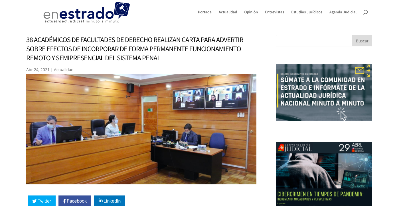 38 académicos de Facultades de Derecho realizan carta para advertir sobre efectos de incorporar de forma permanente funcionamiento remoto y semipresencial del sistema penal