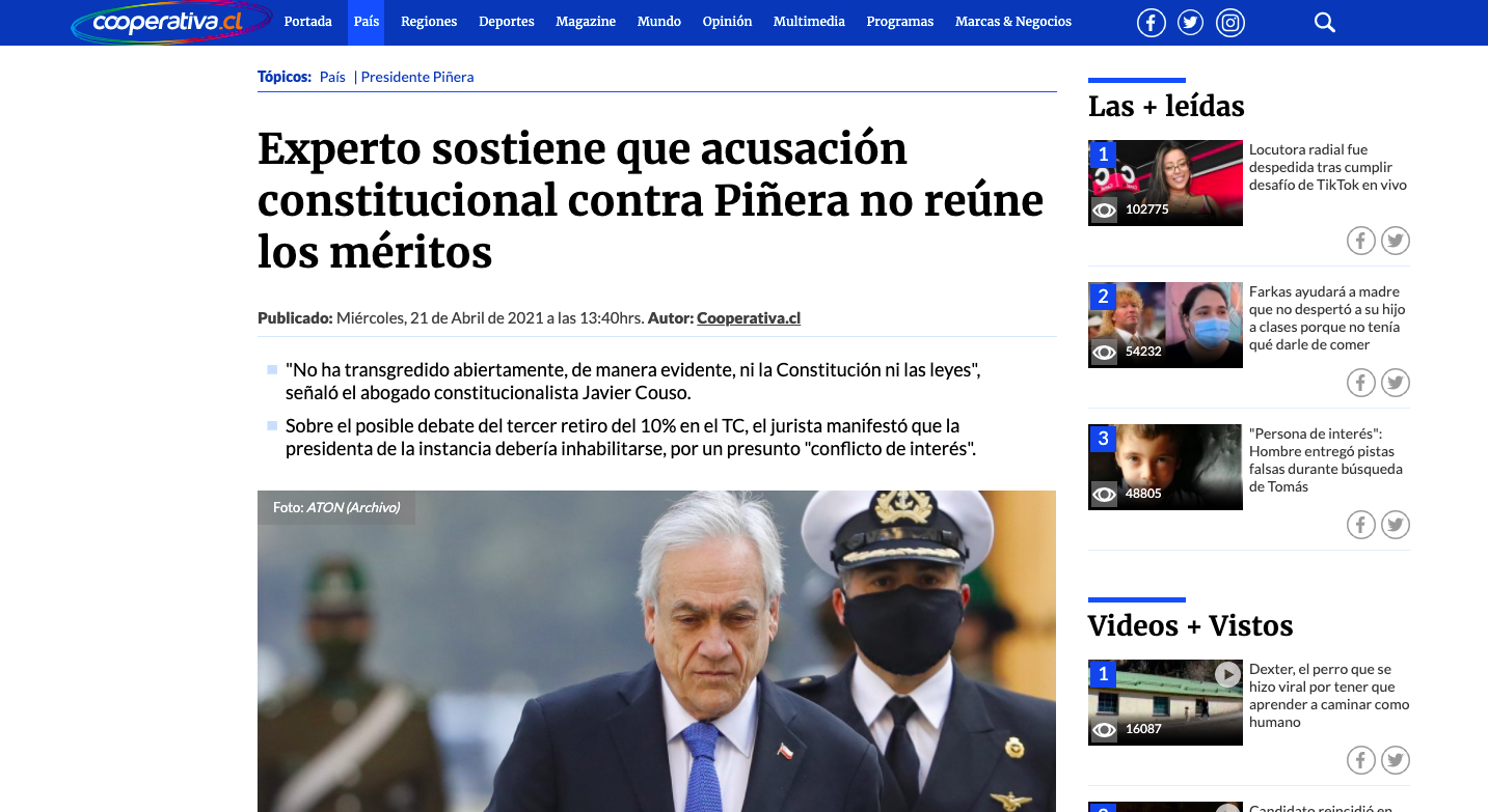 Experto sostiene que acusación constitucional contra Piñera no reúne los méritos