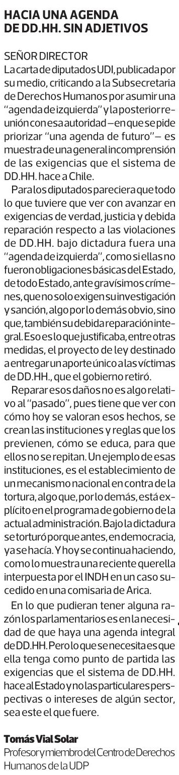 La Tercera | Hacia una agenda de DD.HH. sin adjetivos -Tomás Vial
