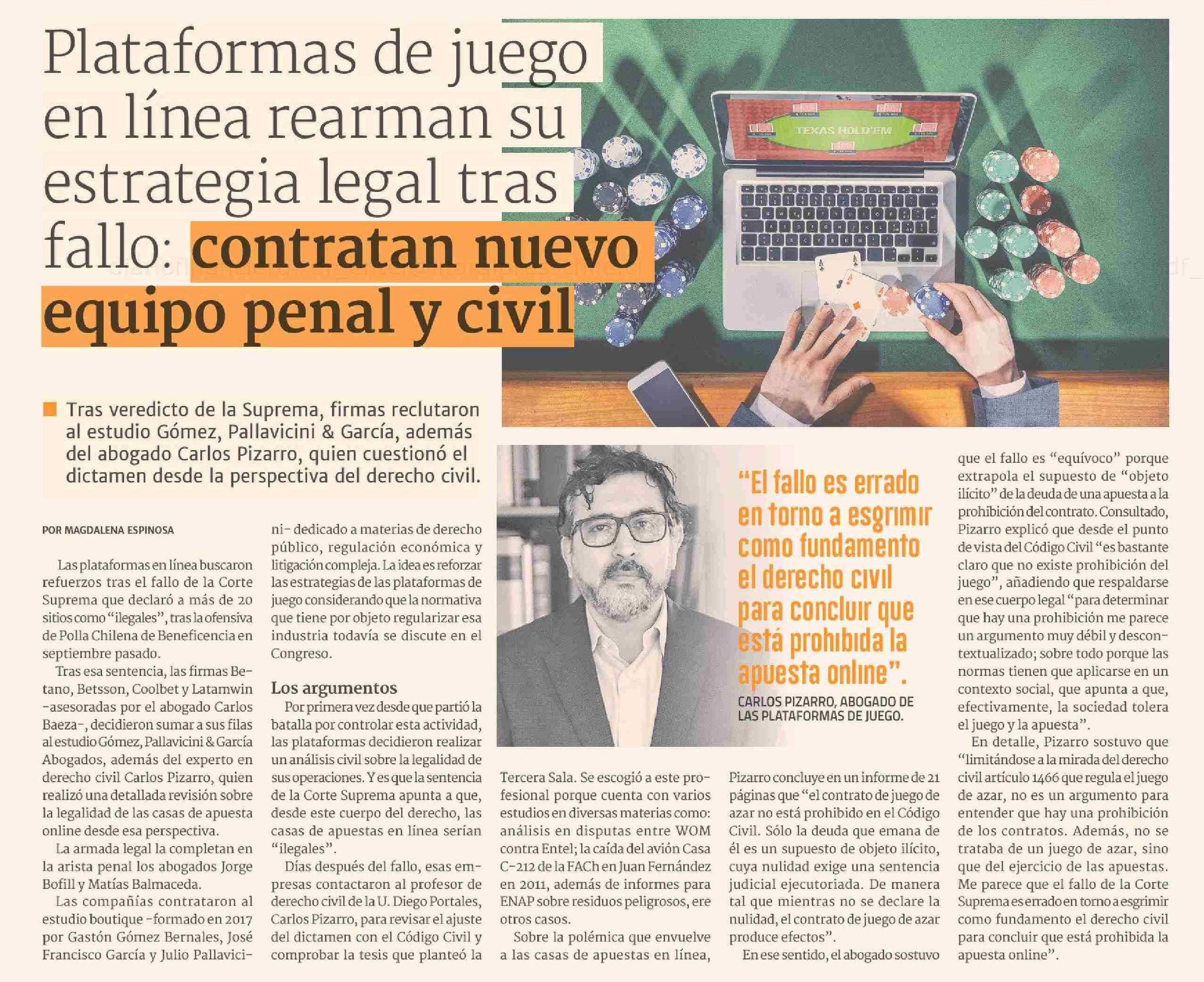 Plataformas de juego en línea rearman su estrategia legal tras fallo: contratan nuevo equipo penal y civil, comenta Carlos Pizarro Wilson