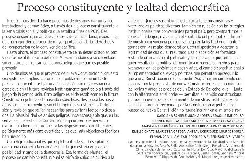 “Compartimos la convicción de que, más que en el resultado del plebiscito, el futuro de nuestra convivencia política se juega en la lealtad que mantengamos con las reglas democráticas, con disposición a aceptar la legitimidad de cualquier resultado”.